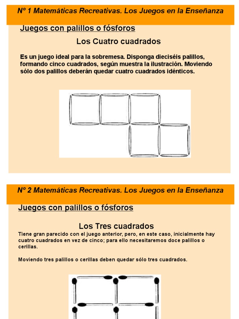 Palitos De Fosforo from imgv2-1-f.scribdassets.com Juegos con palillos y fosforos juegos con palillos y fosforos la solucion de este juego matematico es tan evidente que no te daras Tres fosforos utilizando simplemente tres fsforos, dispngalas de manera que formen un tringulo, sin que sus cabezas toquen la mesa. Si te gusta juegosdiarios.com te animamos a seguirnos y que compartas con tus amigos y familiares nuestros juegos y diversión. Lista com os símbolos mais utilizados na linguagem matemática. Juego de los 15 fósforos by claudio escobar 61309 views. Juegos con palillos y fosforos juegos con palillos y fosforos la solucion de este juego matematico es tan evidente que no te daras quiero recibir un boletín mensual con recursos gratuitos para usar en mis clases. Este juego va de perlas para todos los que dejamos de estudiar hace tiempo. Para ello tendrás que girar los números utilizando las teclas 8 y 9 y tendrás que desplazarte por el cuadro con las teclas de dirección.